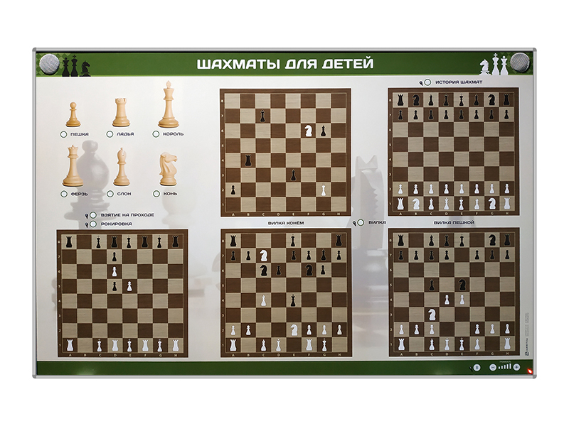 Электрифицированный стенд представляет собой панель с раздельной секционной световой индикацией, на которой представлена информация об основах игры в шахматы. В конструкцию учебного оборудования интегрированы высокочуствительные сенсоры для управления стендом при помощи интерактивного воздействия приемо-передающих устройств. Стенд оснащен программным обеспечением «Виртуальный учитель», громкость которого изменяется при помощи сенсорного регулятора громкости, расположенного на лицевой поверхности стенда.